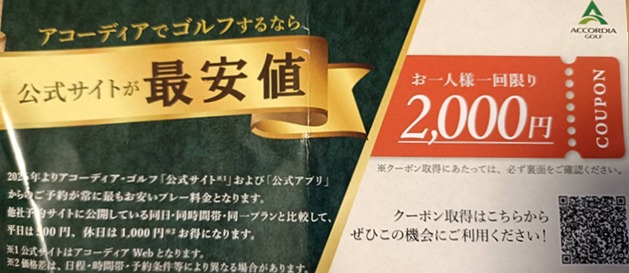 アコーディアの2,000円クーポンはプレー時配られてた以下のクーポン利用、QRコード読み込みで利用出来ます。