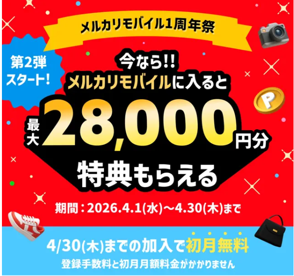 メルカリモバイルから一周年記念祭キャンペーン第二弾が実施中です、期間は2026年4月1日〜4月30日まで
