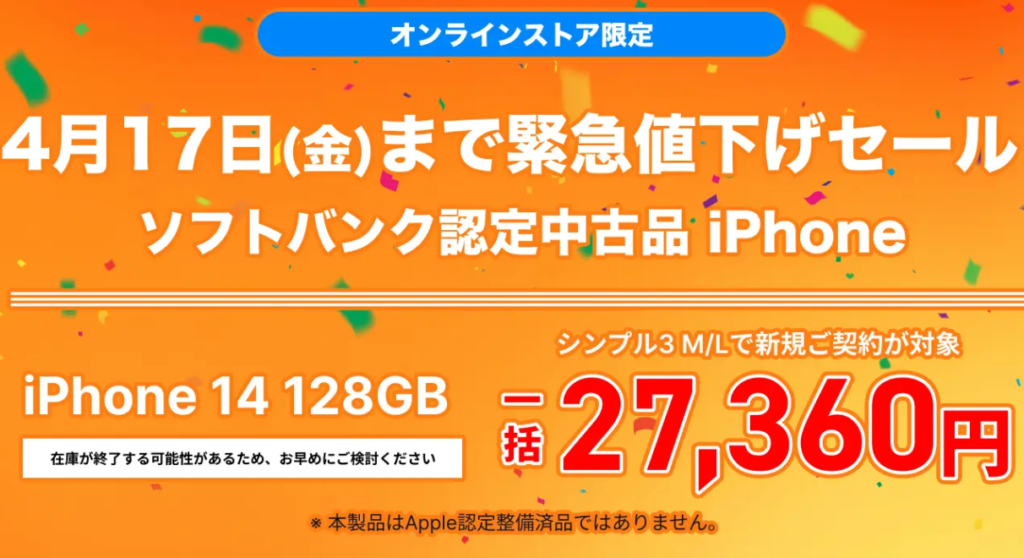 ワイモバイル4/17(金)まで緊急値下げ認定中古iPhone14 128GB